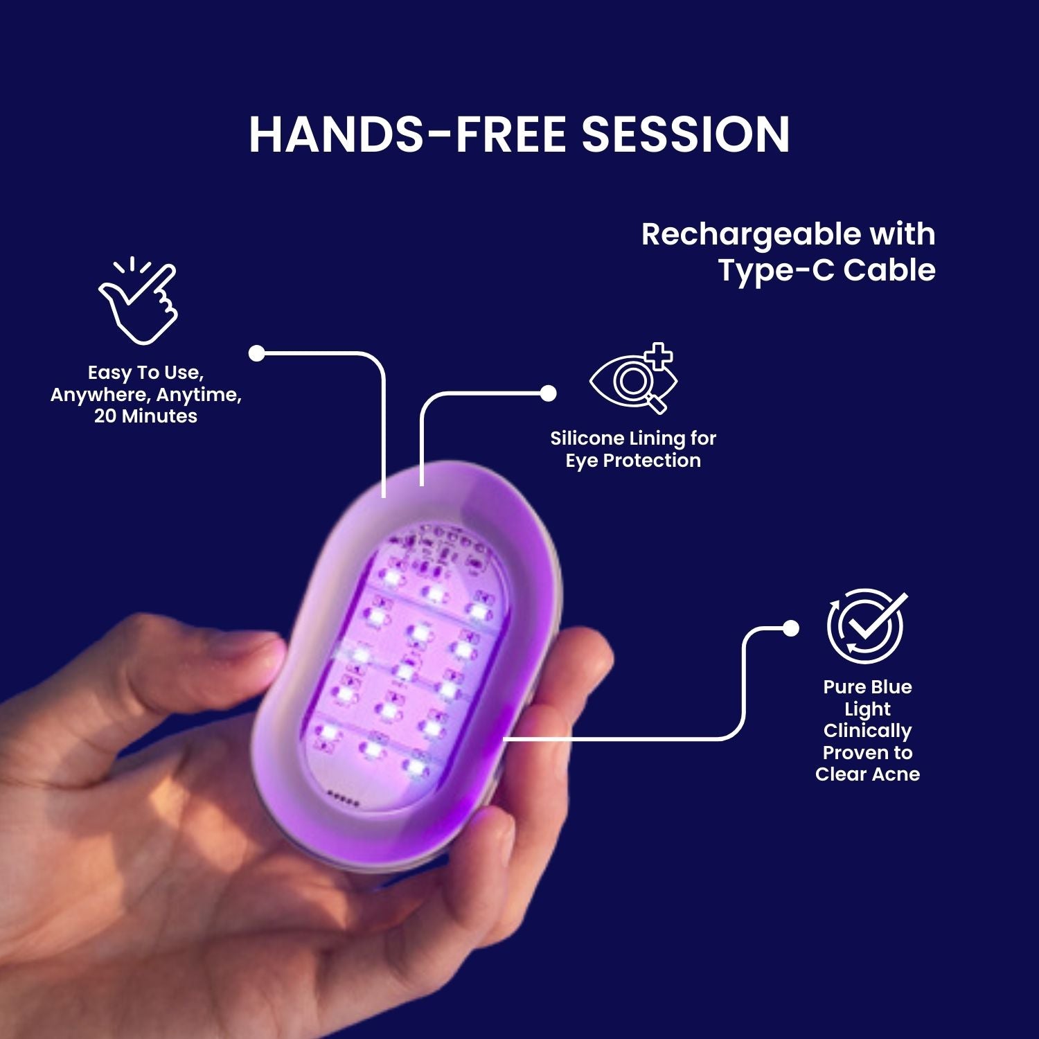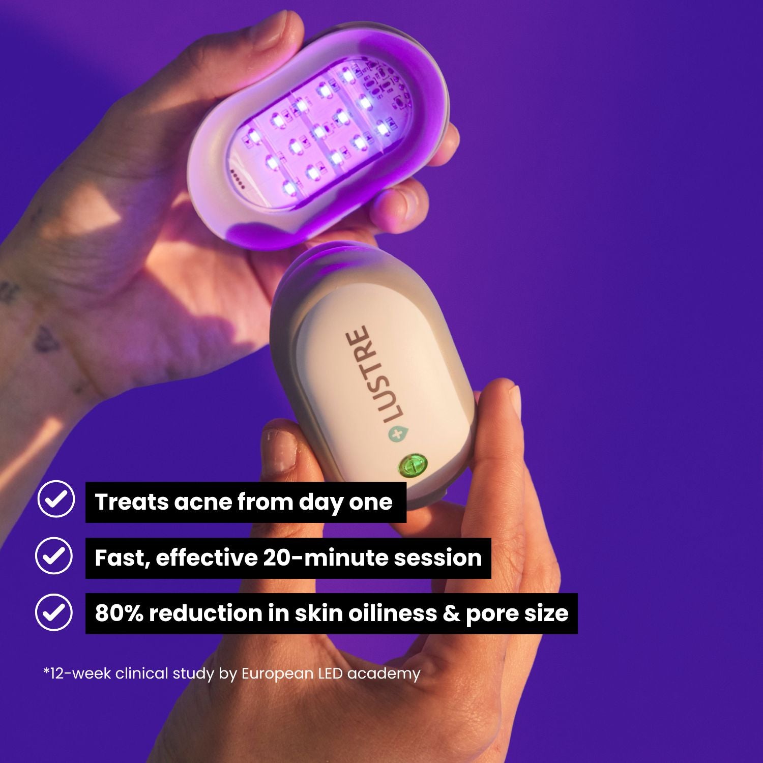 Use LUSTRE® TRIO every day for 20 minutes, for up to 12 weeks to treat your acne. You may continue to use LUSTRE® TRIO thereafter to treat breakouts, as and when needed. Suitable for face, back, shoulders and any other areas affected by acne.